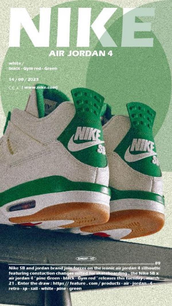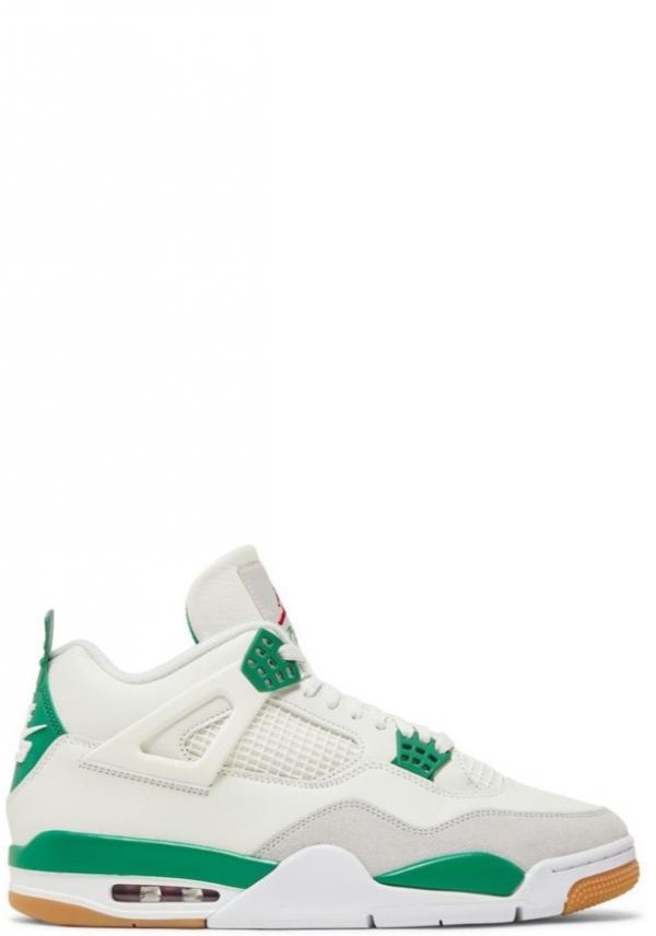 The Nike SB x Air Jordan 4 Retro SP 'Pine Green' presents a skate-ready version of the legacy silhouette. Crafted from smooth off-white leather, the upper is reinforced with a forefoot overlay in light grey suede. Contrasting green accents land on the molded eyelets and heel tab, the latter marked with embossed Nike SB branding. A crimson Jumpman on the Flight tongue tag provides an unexpected pop of color. The sneaker rides on a two-tone foam midsole, fitted with an exposed Air-sole unit in the heel and supported by a gum rubber outsole.